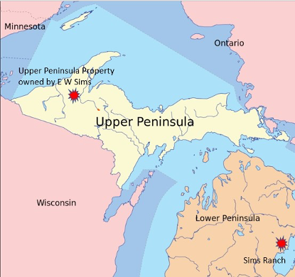 More than 400 miles from Sims Ranch, Edwin Sims owned a large parcel of land in the upper peninsula of Michigan. It included the Premo Dam on the Hemlock river in Hematite Township, Iron County. No one knows how or why he acquired this property. |