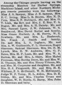 | The family often spent their summer vacations in northern Michigan taking a steamer from Chicago to Harbor Springs and Mackinaw Island. She loved the outdoors and enjoyed sailing and horseback riding. |