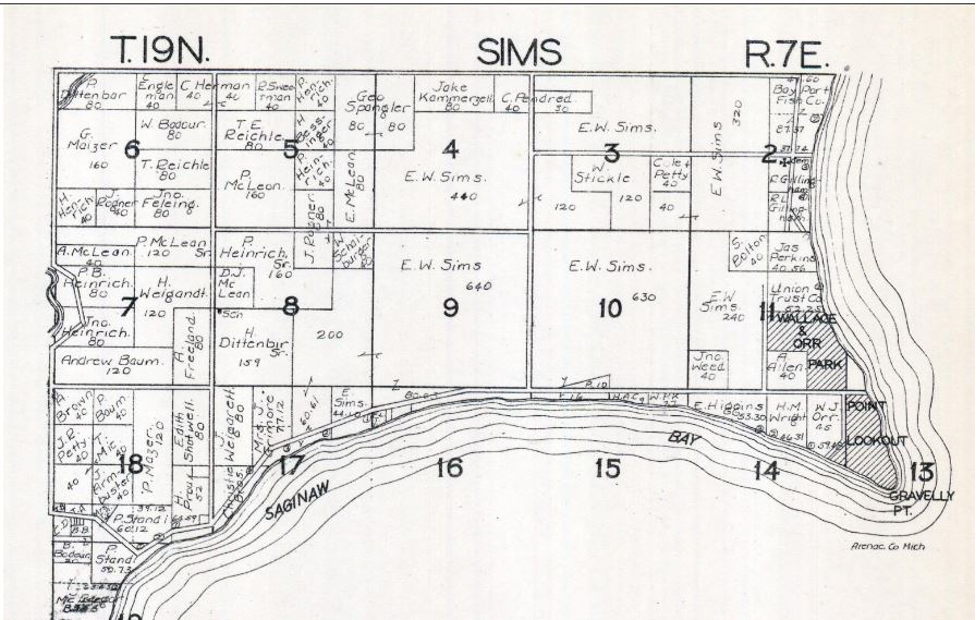 As Edwin W. Sims’ fortunes and family grew, he and Lottie started looking for a place to relax away from the stresses of the big city. He had loved Saginaw Bay as a young man living in Bay City, and by 1907 (after the anti-trust case against Standard Oil) he and Charlotte started to search for a place where he could “sail a boat and live in the woods.” He reportedly bought a boat in Bay City and sailed to Port Au Gres; further up the shore on the west side of Saginaw Bay; nearby where he went camping as a young man. he found the wide beach and deep woods he wanted. While Pt. Lookout was a well-established vacation spot with weekend steamers from Bay City, the majority of land to the west had been abandoned and was considered worthless being mostly swamp, swale, and sandy ridge.
