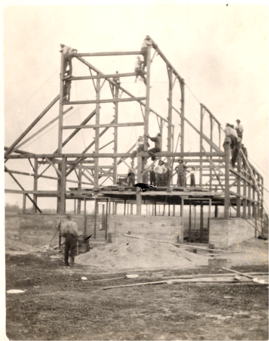 Raising the barn at the North End Farm circa 1922. The barn still exists on the farm at the Southeast corner of Delano and Bessinger Roads |