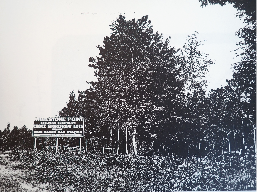 Large sign advertising the subdivision of White Stone Point – directing potential buyers to Herb Sims at the Sims Ranch Gas Station. |