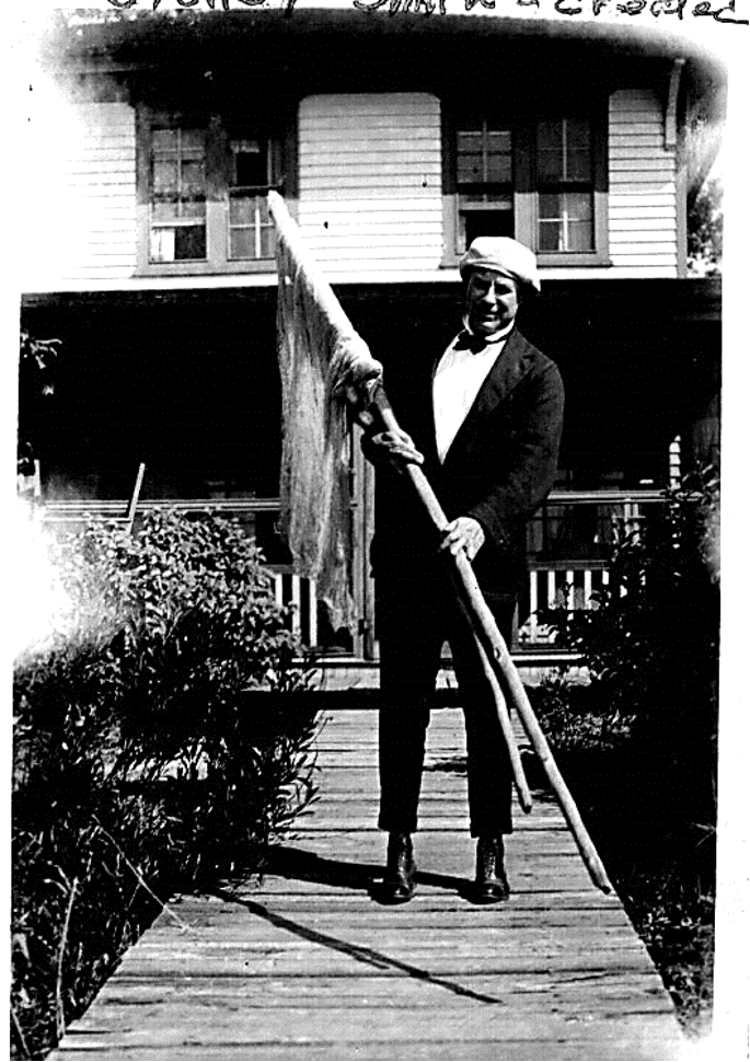 Sydney Smith, cartoonist who drew Andy Gump, bringing fish nets down to the boats in front of the Ranch House |