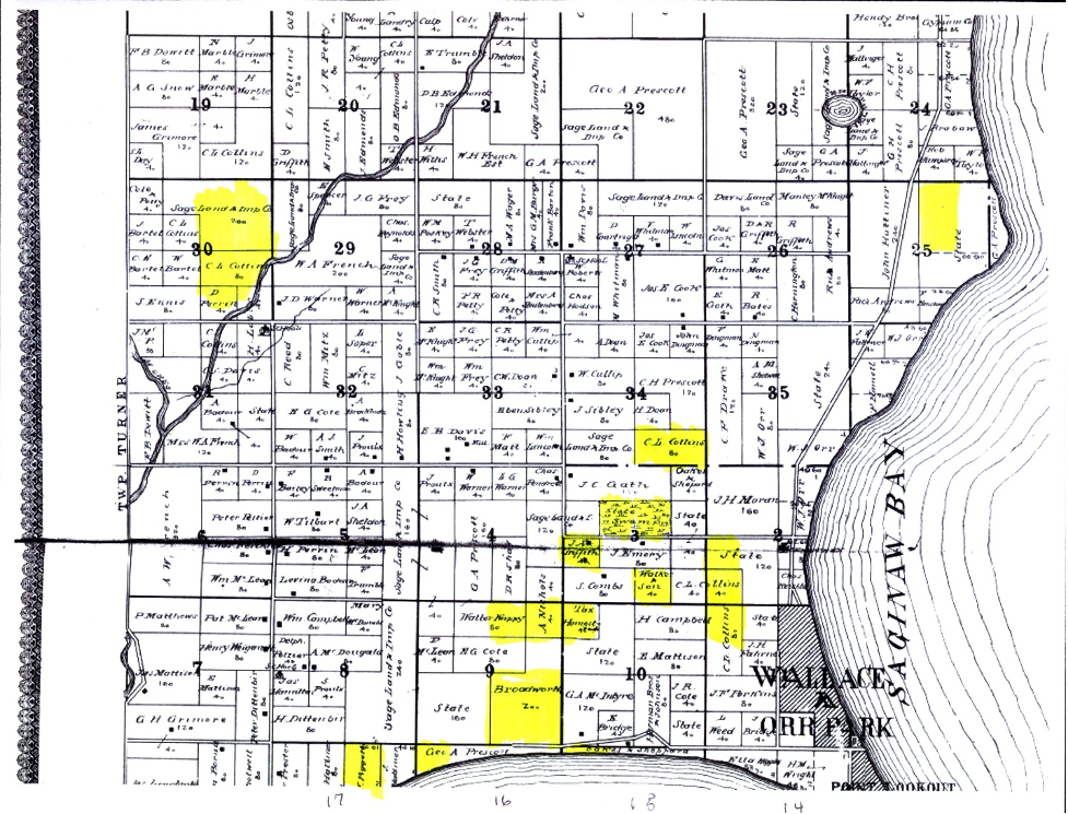 Plot map of Arenac county about 1925 showing land owned by E W Sims at that time. This does not include land owned on Pt Au Gres and other areas of Arenac County.